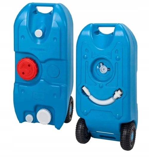 - Wysokiej jakości 40-litrowy, przenośny pojemnik na wodę, wyposażony w kółka i uchwyt transportowy.