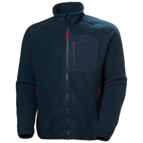 BLUZA MĘSKA HELLY HANSEN PANORAMA PILE BLOCK JACKET - to męska bluza rozpinana, uszyta z grubego materiału polarowego, który w całości pochodzi z recyklingu. Zastosowany materiał o wysokiej sprężystości i doskonałych właściwościach termoizolacyjnych, który przypomina swoją strukturą delikatne owcze futro, doskonale chroni przed chłodem. Bluza jest zapinana na zamek błyskawiczny z wewnętrzną patką, osłaniająca szyję i podbródek oraz wyposażona w dwie boczne kieszenie zapinane na zamki błyskawiczne. Na lewej piersi znajduje się panel z grubej tkaniny, ozdobiony logo HH i zawierający poręczną z kieszenią na telefon - również zamykaną suwakiem. Wszystkie końcówki zamków błyskawicznych ozdobiono czerwonymi troczkami, co nadaje bluzie oryginalny wygląd. Raglanowy krój rękawów, usztywnienie kołnierza oraz obszycia końcówek mankietów i dolnego obwodu sprawiają, że jest wygodna, trzyma fason i dobrze dopasowuje się do sylwetki.  Idealna jako uniwersalna warstwa wewnętrzna w sezonie zimowym lub samodzielna kurtka przejściowa. Stanowi niezastąpiony element garderoby oraz dobry wybór dla tych miłośników aktywności outdoorowej, dla których komfort termiczny jest najważniejszy, ale nie chcą zrezygnować z oryginalności i dobrego stylu.
