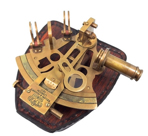 SEKSTANT MOSIĘŻNY W SKÓRZANYM ETUI - to narzędzie nawigacyjne, które służy do mierzenia kątów poziomych i pionowych. W astronawigacji używa się go do pomiaru wysokości ciał niebieskich nad horyzontem, natomiast w nawigacji do mierzenia kątów pionowych i poziomych między obiektami widocznymi na Ziemi. Urządzenie stosowane głównie w żegludze - żeglarze nadal uczą się, jak go używać, aby w razie awarii systemu GPS móc określić pozycję statku na podstawie obserwacji i pomiarów ciał niebieskich. Sekstant to świetny pomysł na prezent dla żeglarza, astronoma, czy też fana zabytków techniki. Będzie piękną ozdobą gabinetu, biura lub kajuty.