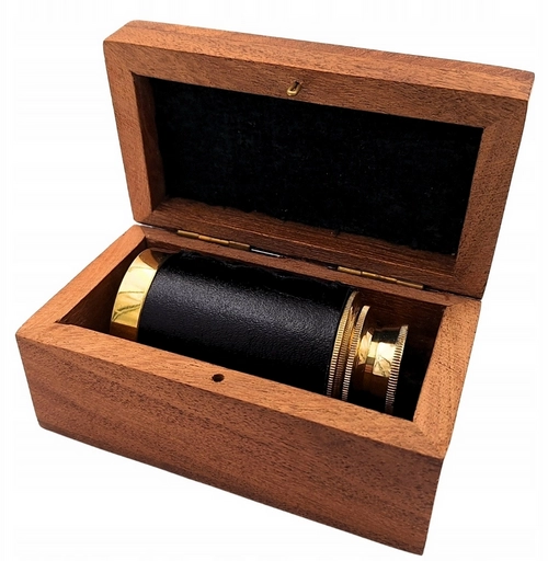 - Stylowa luneta mosiężna w drewnianym pudełku to elegancki gadżet dla miłośników stylu retro, historii i marynistycznych dodatków.