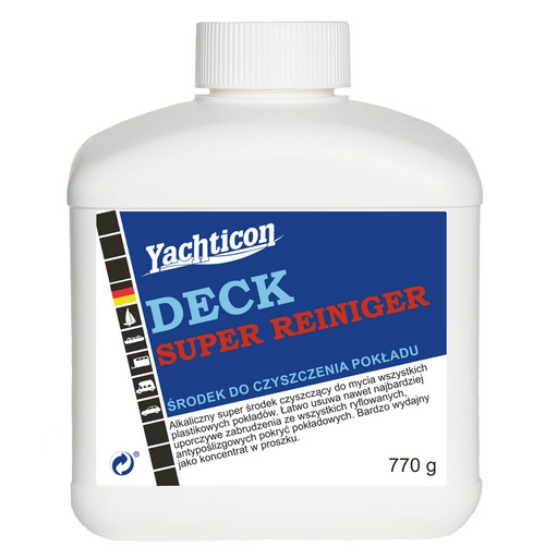 Yachticon Deck Super Reiniger - Alkaliczny środek do czyszczenia pokładów z laminatu. Bez trudu usuwa nawet najbardziej uporczywe zabrudzenia. Działa idealnie na każdego rodzaju powierzchniach, rowkowanych, gładkich i także tych antypoślizgowych. Jest bezpieczny dla żelkotu. Zachowuję właściwości antypoślizgowe. Działą również w słonej wodzie morskiej.