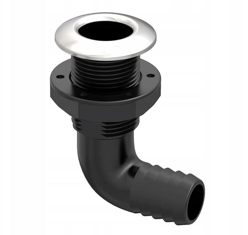 PRZEJŚCIE BURTOWE KĄTOWE (90°) NA WĄŻ Ø 26 mm (1″) - Solidne, kątowe przejście burtowe (90°), wykonane z nylonu wzmocnionego włóknem szklanym, z nakładką ze stali nierdzewnej 316. Potrzebne tam, gdzie instalacja prosta nie jest możliwa — szczególnie przy ograniczonej przestrzeni lub konieczności prowadzenia węża pod kątem. Idealne do odprowadzania wody z kokpitu, zęz, instalacji sanitarnych i innych zastosowań morskich, dzięki odporności na korozję i promieniowanie UV.