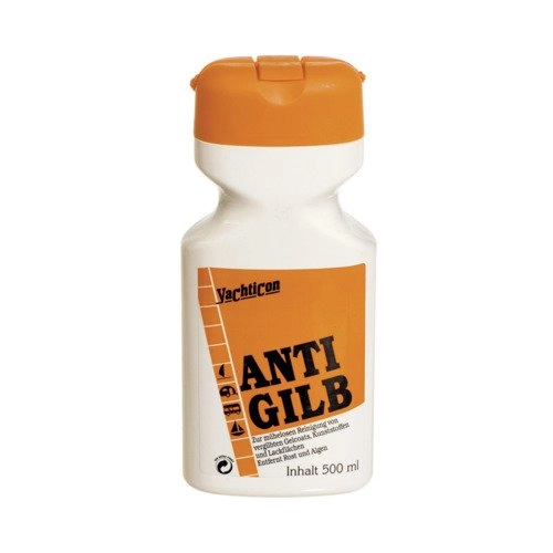 Yachticon Anti Gilb - Środek specjalnie opracowany do usuwania żółtych przebarwień z żelkotu i farby – tzw. „żółtej fali” na dziobie, linii wodnej oraz w okolicach wydechu. Bardzo łatwy w użyciu – produkt wystarczy nanieść gąbką, pozwolić mu działać przez 5 minut, a następnie spłukać wodą. Usuwa także przebarwienia z rdzy i algi.