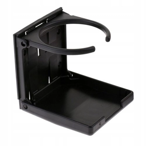 - Składany uchwyt do napojów, wykonany z wytrzymałego plastiku w kolorze czarnym.