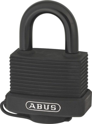 - Wodoodporna kłódka mosiężna w plastikowej osłonie koloru czarnego, wyprodukowana przez niemiecką firmę ABUS®