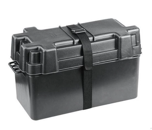 Pojemnik na akumulator o pojemności do 120 Ah, wykonany z czarnego polipropylenu odpornego na działanie kwasów. Wyposażony w pasek oraz regulację wielkości wnętrza.