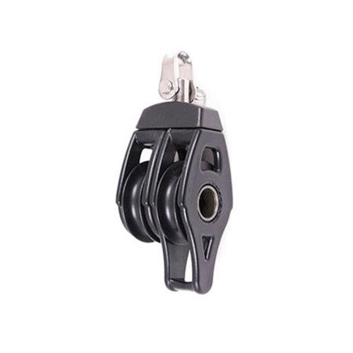 Łożyskowany podwójny bloczek 40 mm z zaczepem, krętlikiem i szeklą. Dzięki zastosowaniu otwartej osi aluminiowej z dużym otworem bloczek jest dużo lżejszy w porównaniu ze stalowym. Solidna jednorodna obudowa z kompozytu jest odporna na uderzenia i przecinanie, a nylonowa rolka uformowana w sposób zapewniający optymalne ułożenie liny