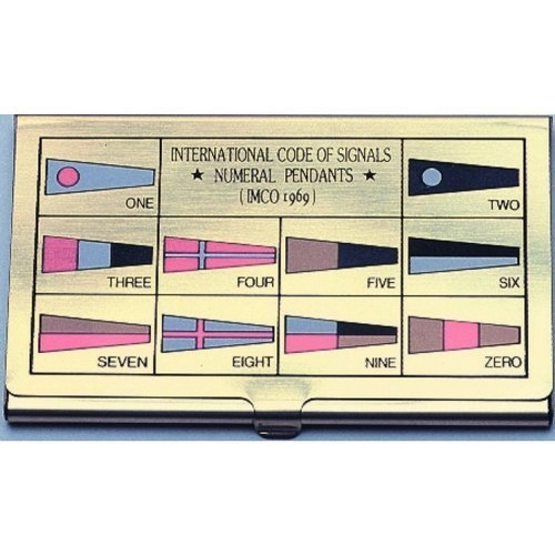 WIZYTOWNIK z kodami flagowymi - wykonany z mosiądzu i ozdobiony flagowymi symbolami cyfr według międzynarodowego systemu kodów sygnałowych, stosowanych na morzu. Umożliwia wygodne i bezpieczne przechowywanie wizytówek. Doskonały gadżet w klasycznym stylu oraz świetny pomysł na prezent.