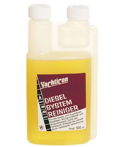 YACHTICON DIESEL REINIGER - Wysokoskoncentrowany czyszczący dodatek uszlachetniający do wszystkich gatunków oleju napędowego Diesel i Super Diesel. Oczyszcza dysze wtryskiwacza, pompę wtryskową oraz cały system paliwowy z osadów. Dzięki czystym agregatom wtryskowym dba o niskie zużycie, spalanie niezanieczyszczające środowisko oraz o niezawodność eksploatacji. Chroni silnik, zmniejsza „zbijanie” dzięki optymalnemu wtryskowi, chroni przed korozją. Zawartość butelki pozwala na dwukrotne zastosowanie. Wlać 250 ml do prawie pustego zbiornika. Uruchomić silnik na ok 10 min. Następnie ponownie napełnić zbiornik paliwem. Wówczas układ napędowy jest całkowicie oczyszczony.