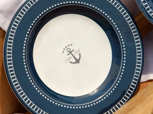 Kolekcja SAILOR SOUL to wyjątkowe połączenie marynistycznego stylu i eleganckiego wykończenia. Delikatny wzór kotwicy oraz morska kolorystyka sprawiają, że naczynia pięknie prezentują się na żeglarskim stole. Dodatkowo niewielkie tłoczenia oraz połysk talerzy czyni je niezwykle eleganckimi.