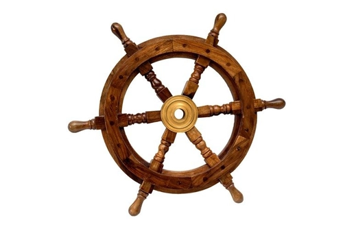 Dekoracyjne, drewniane koło sterowe o średnicy 24". Replika zabytkowego przyrządu marynistycznego. Wewnętrzna część została wykonana z mosiądzu i ma standaryzowany wymiar wewnętrzny, dzięki czemu może służyć zarówno jako stylowa dekoracja wnętrza w klimacie marynistycznym, jak również jako prawdziwe koło sterowe na jachcie.