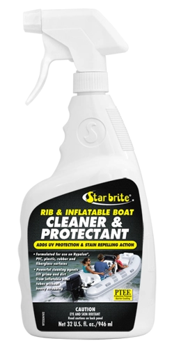 RIB & INFLATABLE BOAT CLEANER & PROTECTANT to środek amerykańskiej firmy STAR BRITE specjalnie opracowany do mycia i konserwowania pontonów, ribów, supów, kajaków, kół do ciągnięcia za motorówką itp. Jest skuteczny oraz bezpieczny dla PVC, hypalonu, laminatu z włókna szklanego, gumy i wielu innych materiałów. Głęboko wnika w plamy, różne osady i inne zabrudzenia, rozpuszcza je i usuwa bez konieczności intensywnego szorowania. Jednocześnie zostawia na czyszczonej powierzchni powłokę polimerową, która zabezpiecza przed ponownym powstawaniem zabrudzeń oraz osadów, a także przed szkodliwym działaniem promieniowania UV. Dzięki butelce z atomizerem jest wygodny w użyciu.