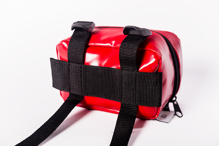 Apteczka została wykonana z trwałego materiału powlekanego PCV oraz z z trwałego materiału Codura, dzięki czemu jest wysoce odporna na przecieranie i przemakanie. Dodatkowo wyposażona w bryzgoszczelny zamek, który niweluje przemakanie zawartości. Dzięki temu nawet jeśli apteczka wpadnie do wody możemy być spokojni o jej wyposażenie. Dzięki zastosowaniu zamykanych kieszeni, wyposażenie apteczki pozostaje na miejscu po jej otwarciu i rozłożeniu. Posiada specjalny system mocowania do roweru.