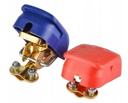 Komplet samozaciskowych klem do akumulatora. Umożliwiają szybkie odłączenie i podłączenie akumulatora, bez użycia narzędzi. Zdjęcie i założenie klem następuje odpowiednio - poprzez podniesienie i opuszczenie plastikowych osłon. Różne kolory plastikowych osłon ułatwiają szybką identyfikację plusa i minusa. Jest to idealne rozwiązanie w sytuacjach, gdy akumulator trzeba często demontować i zabierać. Montaż przewodów elektrycznych do klem jest również łatwy i nie wymaga lutowania.