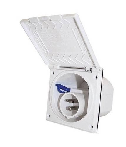 Wpuszczane gniazdo elektryczne przeznaczone do jachtów oraz kamperów. Wykonane z mocnego tworzywa. Wyposażone w zatrzask zabezpieczający przed przypadkowym wyrwaniem wtyczki z gniazda.