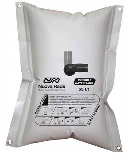 Elastyczny zbiornik na wodę pitną o pojemności 100 litrów wykonany z solidnego i trwałego PCV wzmocnionego siatką poliestrową. Tego typu zbiorniki można łatwo i szybko zainstalować na łodzi lub w przyczepie kempingowej. Nadają się do instalacji w miejscach trudnodostępnych, ponieważ z łatwością przyjmują kształt, na jaki pozwala im wolna przestrzeń. Dzięki zastosowaniu elastycznego materiału nie ma konieczności stosowania odpowietrznika.