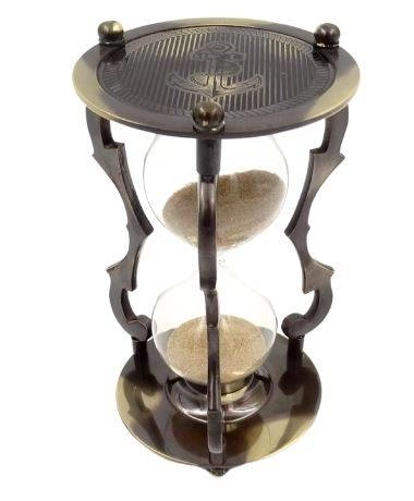 Stylizowana na antyk klepsydra z mosiądzu, zamontowana w zdobionej, mosiężnej konstrukcji. Na topie oraz na spodzie zwieńczona symboliczną kotwicą. Wyrób rzemiosła artystycznego. Gustowny element dekoracyjny, który może być jednocześnie przydatnym narzędziem w kuchni. Idealnie nadaje się również do ozdobienia gabinetu żeglarza lub podróżnika.