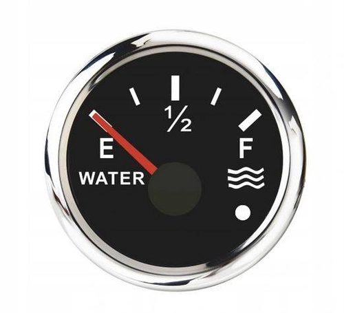 ZEGAR / WSKAŹNIK POZIOMU WODY 0-190 OHM - Wysokiej jakości pokładowy wskaźnik poziomu wody o średnicy 56 mm. Wykonany z wytrzymałego tworzywa i wykończony ramką ze stali nierdzewnej.