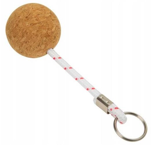 - Klasyczny brelok do kluczy w kształcie kuli, wykonany z naturalnego korka i polipropylenowej linki pływającej. Zakończony klasycznym kółkiem do kluczy, z nierdzewnej stali.