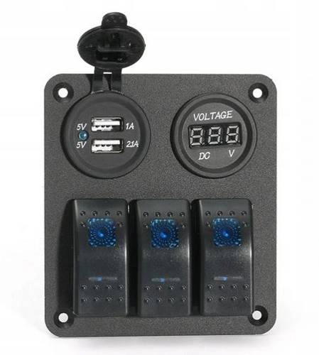 ROZDZIELNIA ELEKTRYCZNA 3 OBWODOWA Z USB I WOLTOMIERZEM - Profesjonalna tablica elektryczna, rozdzielnia 3 - obwodowa z automatycznymi bezpiecznikami, podwójnym USB i woltomierzem. Włączniki oraz tło naklejek identyfikacyjnych podświetlane ledowo. W komplecie styki, naklejki i komplet śrub montażowych. Rozdzielnia jest wodoodporna IP65. Urządzenie posiada certyfikat CE