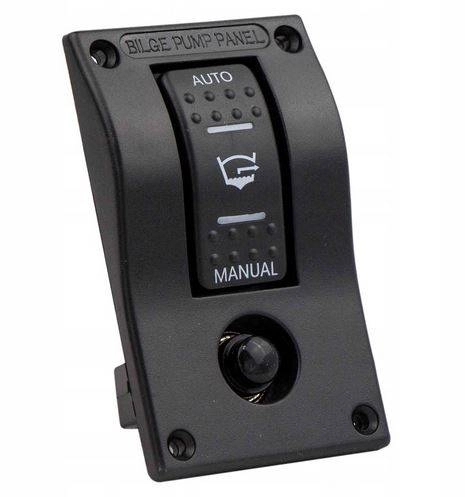PRZEŁĄCZNIK / WŁĄCZNIK POMPY ZĘZOWEJ - Uniwersalny panel kontrolny dla pomp zęzowych posiadających automatyczny włącznik (pływakowy lub elektorniczny). Umożliwia pracę w trybie ON-OFF-(ON): automatycznym, wyłączonym lub ręcznym (wymuszany powrót do pozycji wyłączony - zabezpieczenie). Posiada podświetlenie LED kolor zielony (tryb automatyczny) i czerwony (tryb ręczny). Na panelu znajduje się gniazdo z automatycznym bezpiecznikiem termobimetalicznym. Wykonany z wysokiej jakości mocnego tworzywa w kolorze czarnym.