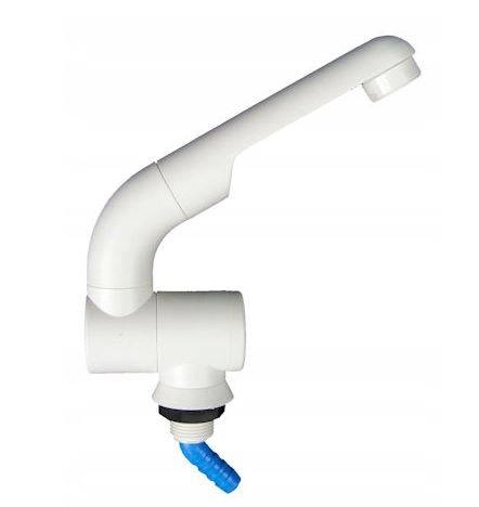 BATERIA / KRAN / WYLEWKA BEZ POKRĘTŁA - Markowy, wysokiej jakości kran wykonany w Niemczech. Wykonany z PCV o długości 16 cm. Kran posiada regulację kąta nachylenia w poziomie i pionie. W zestawie komplet uszczelek. Maksymalna temperatura wody do 80 C. Maksymalne ciśnienie 10 Bar. Idealny do łodzi, przyczep kempingowych i kamperów.