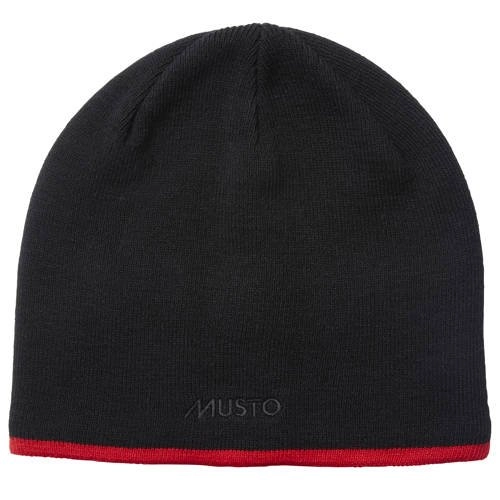 MUSTO KNITTED BEANIE - to uniwersalna czapka zimowa, uszyta z podwójnie złożonej dzianiny akrylowej i dodatkowej warstwy miękkiego materiału polarowego w dolnej części, która nie daje lepszą ochronę przed zimnem, ale również zapewnia komfort dla skóry. Jest mięsista, ciepła i elastyczna. Dobrze przylega do głowy i gwarantuje maksymalny komfort termiczny. Ozdobiona czerwonym paskiem na dolnej krawędzi oraz dyskretnym haftem z logo Musto.