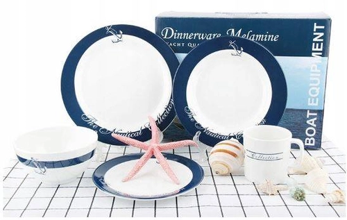 KOMPLET NACZYŃ Z MELAMINY MARINE NAUTICAL - Zestaw obiadowy wykonany z najwyższej jakości melaminy ozdobiony stylowymi motywami marynistycznymi. Naczynia z melaminy to wymarzone rozwiązanie dla osób zainteresowanych aktywnym wypoczynkiem. Charakteryzują się trwałością, uniwersalnością, szeroką gamą kolorystyczną i nowoczesnym designem. Wszystkie naczynia z tej serii wyprodukowane zostały z najwyższej jakości tworzywa. Są lekkie, odporne na niskie temperatury jak również wysokie (+70 stopni) oraz można myć je w zmywarce przy użyciu delikatnych środków myjących. Unikalne właściwości naczyń gwarantują nam komfort i wygodę w każdych warunkach. Ze względu na niewielką wagę oraz odporność na uszkodzenia mechaniczne produkty te bardzo dobrze sprawdzają się jako wyposażenie łodzi, pojazdów kempingowych a także można je zabrać pod namiot. Nie należy używać szorstkich gąbek podczas mycia ręcznego. Dzięki temu ich połysk zostanie na długo zachowany.