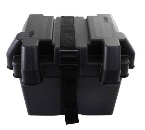 Pojemnik na akumulator o pojemności do 80 Ah - Pojemnik na akumulator o pojemności do 80 Ah, wykonany z czarnego wzmocnionego polipropylenu odpornego na działanie kwasów. Posiada wygodne uchwyty do przenoszenia oraz wyprofilowane wyjścia na przewody. W komplecie przelotki wraz z pasem montażowym i nierdzewnymi wkrętami.