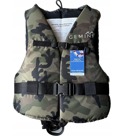 KAMIZELKA WĘDKARSKA ASEKURACYJNA GEMINI STANDARD- Lekka i wygodna kamizelka asekuracyjna, która łączy w sobie nowoczesną funkcjonalność z klasycznym wzornictwem typu moro. Zapinana za pomocą regulowanych 2 mocnych pasów z klamrą oraz sznurkowego ściągacza w dolnej części, jest łatwa do zakładania, dobrze przylega do ciała i nie krępuje ruchów. Komfort użytkowania dodatkowo poprawia zastosowanie miękkiej pianki wypornościowej. Dodatkowo kamizelka posiada pasek krokowy uniemożliwiające wysunięcie z kamizelki osoby, która ma ją na sobie. Posiada ergonomiczny kształt dzięki czemu nie krępuje ruchów. Ta kamizelka asekuracyjna jest idealna także do aktywnego uprawiania sportów wodnych, takich jak: rafting, kajakarstwo, windsurfing, żeglarstwo, SUP.