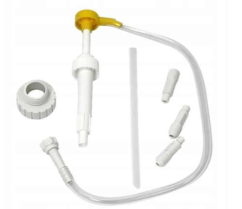 UNIWERSALNA POMPKA DO OLEJU PRZEKŁADNIOWEGO - Pompka do wymiany oleju przekładniowego w spodzinie silnika zaburtowego lub stacjonarnego na łodziach i jachtach. Nakręca się ją na butelkę do oleju. Służy do wtłoczenia oleju przekładniowego do spodziny silnika. Końcówka rurki jest zakończona gwintem. To rozwiązanie zapewnia całkowitą szczelność podczas wymiany. W komplecie rurki, redukcja gwintu do butli galonowych oraz trzy wymienne adaptery o różnych gwintach (M8, M10, M 3/8''),